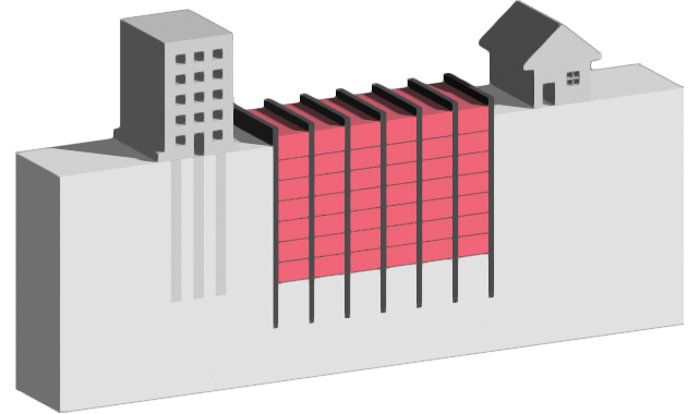 地盤が掘削されたり削られたりする場合に、周囲の土地が崩れないようにするために使用されます。矢板や堰板を使用して土を押さえ、切梁や親柱などの支持構造物で安定させます。